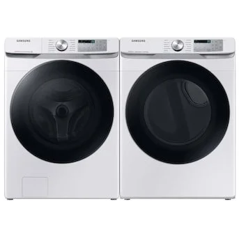 Samsung 4.5 cu. ft. Large capacity smart front load washer with super speed wash - Samsung 7.5 cu ft smart electric dryer with steam sanitize - in champagne. 2 year factory warranty